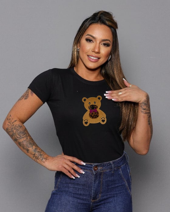 T-SHIRT BÁSICA - APLICAÇÃO TERMOCOLANTE - URSINHO COM LAÇO ROSA