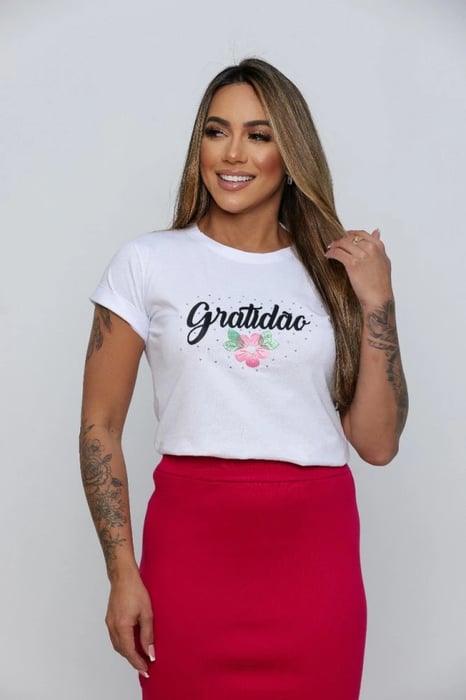T-SHIRT BÁSICA - APLICAÇÃO TERMOCOLANTE - GRATIDÃO ROSA
